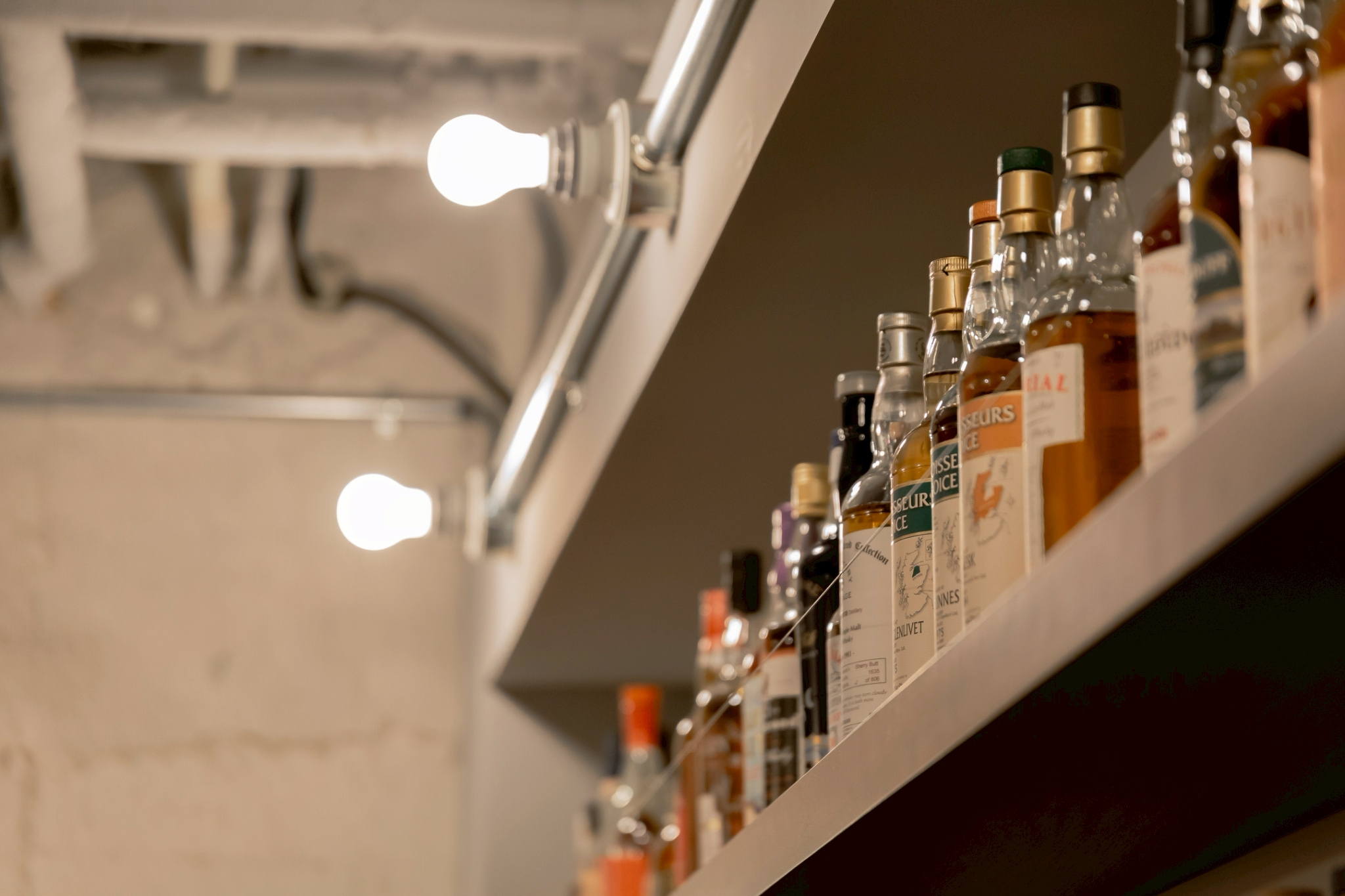 コンクリート打放しの現代的な印象のテナントに、ウイスキーの歴史やオーセンティックさを混ぜることで、若い方にも親しんでもらえるようなデザインに。